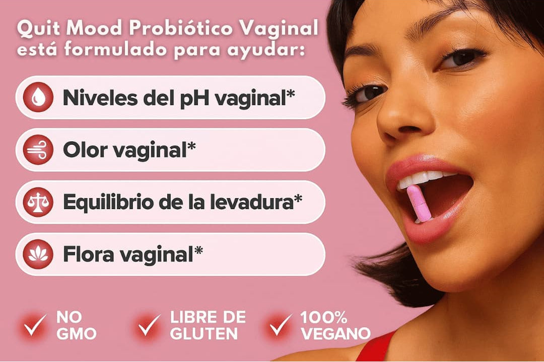 Por eso ofrecemos Quit Mood, un probiótico vaginal natural, vegano y sin gluten, diseñado para equilibrar el pH, reducir el mal olor y promover el bienestar femenino en todas las etapas de la vida.